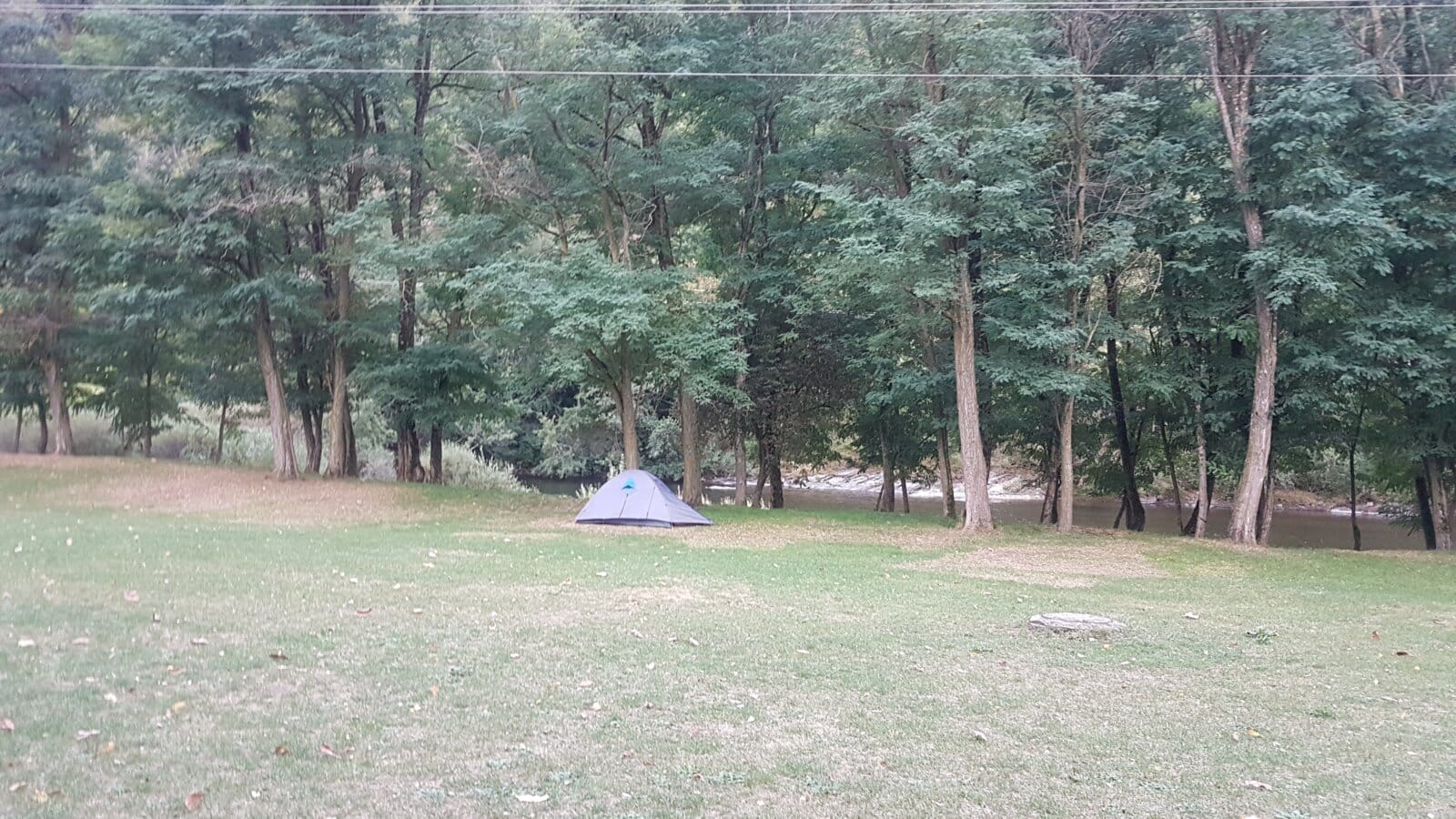 On cherche maintenant notre spot de bivouac pour la nuit. On est quelque part pas loin après le dernier col, sur la ligne de crête, et le sentier évolue désormais pour plusieurs kilomètres sur le versant nord, qui vous vous rappelez est le côté boisé (très boisé) de la montagne. On s’écarte du chemin de Stevenson vers la gauche et trouvons un beau pâturage en pente, plat en haut, à l’orée d’un bois montant vers un nouveau petit sommet, avec une belle vue ouverte vers le sud. C’est parfait. On installe nos tentes et on monte voir le coucher de soleil depuis le sommet, environ 100 mètres au-dessus de nous.